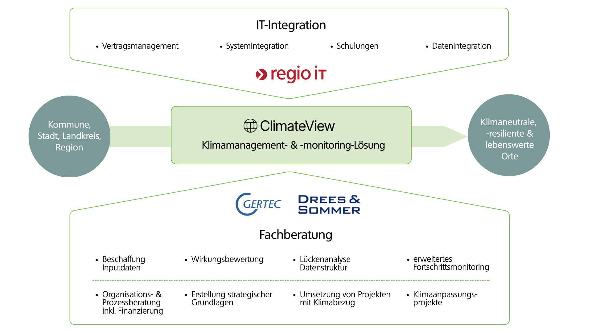 Hier setzt die Komplettlösung der regio iT an: gemeinsam mit ClimateView sowie den Beratungspartnern Gertec und Drees & Sommer bieten wir leistungsstarke Lösungen für kommunales Klimaschutzmanagement und -monitoring. Das Angebot richtet sich an Städte, Kommunen, Regionen und Landkreise jeder Größe und ist unabhängig vom Status Quo im Klimabereich.